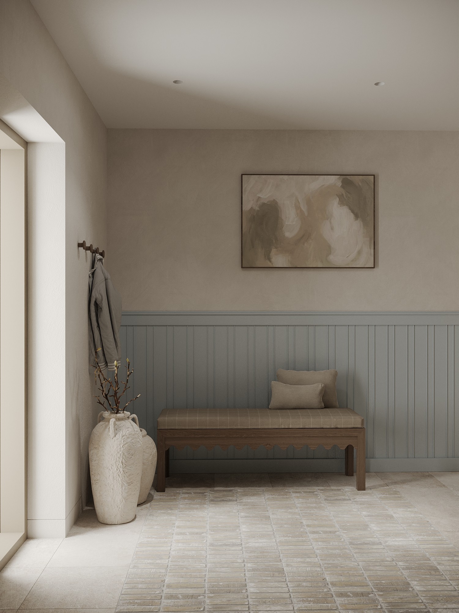 A welcoming entrance that sets the tone for the home’s calm and refined atmosphere.